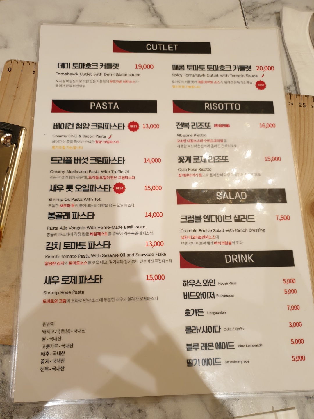 제가 제목을 다른곳과 차별화된 이탈리아 레스토랑이라고 지은 이유는 메뉴판을 보시면 알 수 있습니다. 토마호크 커틀렛부터 청양 그림 파스타, 새우 톳 오일 파스타 등 메뉴 이름이 좀 생소하죠.