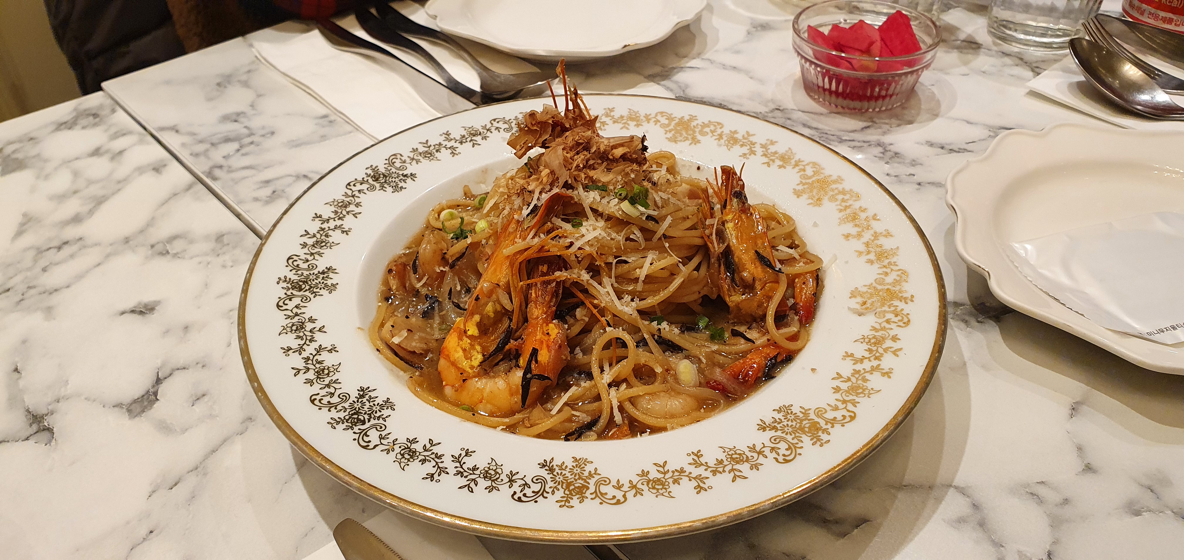 새우 톳 오일 파스타입니다. 저기 검은색으로 보이는 게 톳인데요. 그냥 기본적인 오일 파스타에 톳이 들어가서 그런지 조금 바다의 향이 느껴지는 맛입니다. 거슬릴 정도는 아니고 톳이 들어갔다고 의식하고 먹으니 느껴지는 정도입니다.