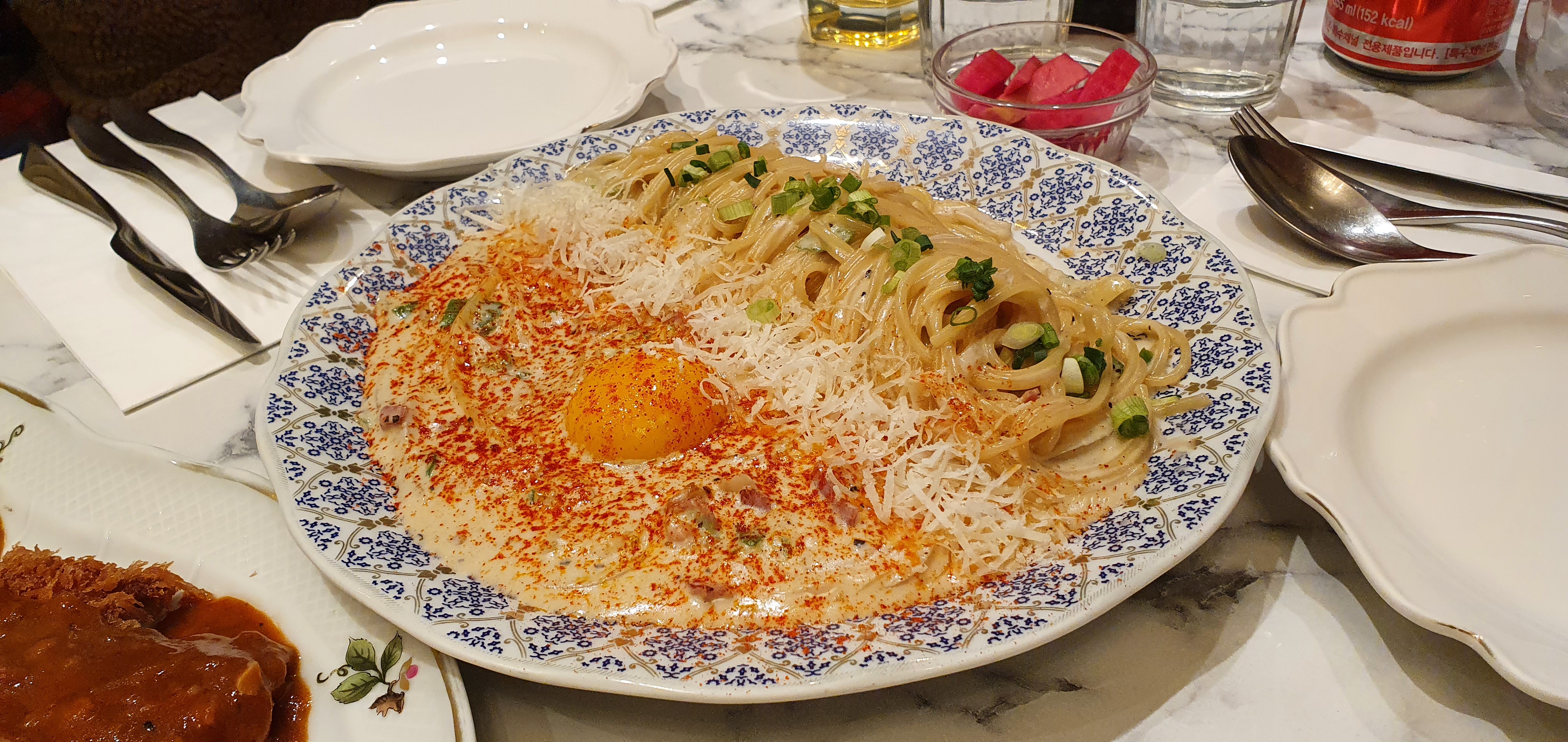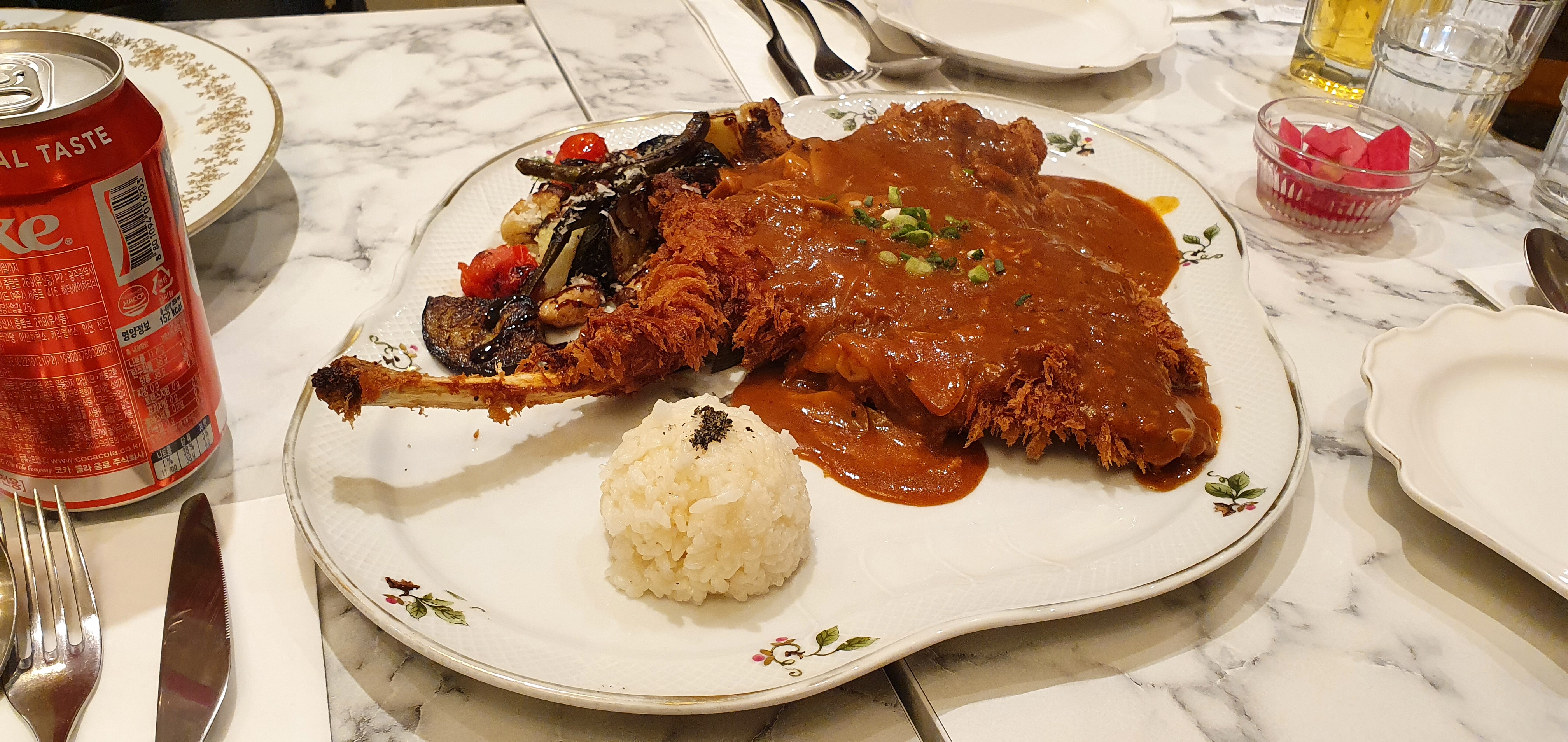 최근에 놀면 뭐 하니에서 가마솥에 토마호크를 구워(튀겨?) 먹는 걸 봐서 토마호크가 어떻게 나올까 궁금해했는데요. 데미 토마호크 커틀렛은 굉장히 돈가스 같죠. 맛도 돈가스 같습니다. 매장이 매우 협소해서 식사 테이블 바로 옆이 주방인데요. 음식을 먹는 와중에도 주방에서 뭔가 굉장히 두드리는 소리가 났는데, 고기를 두드리는 소리였나 봅니다. 맛은 돈가스이긴 한데, 씹는 식감이 뭔가 좀 다르긴 했습니다.