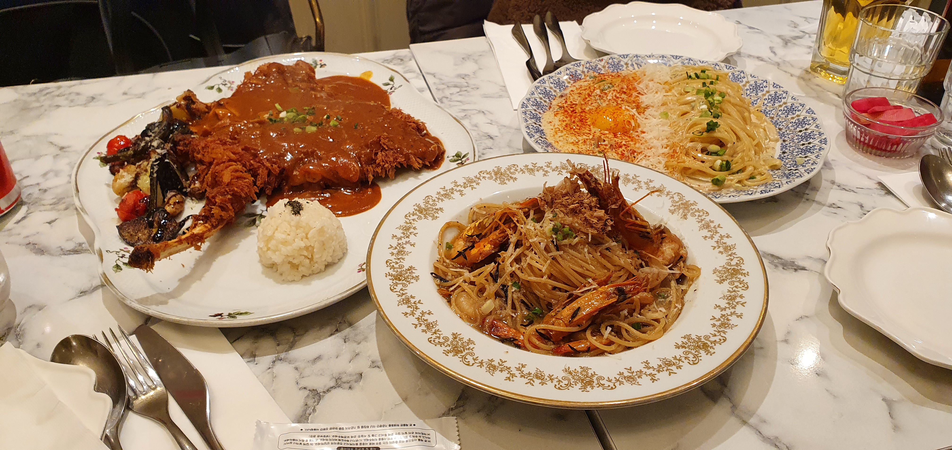데미 토마호크 커틀렛과 베이컨 청양 크림 파스타, 새우 톳 오일 파스타를 시켜보았습니다. 혼자서 이렇게 많이 시킨 건 아니고요. 3명이서 먹을 양입니다.